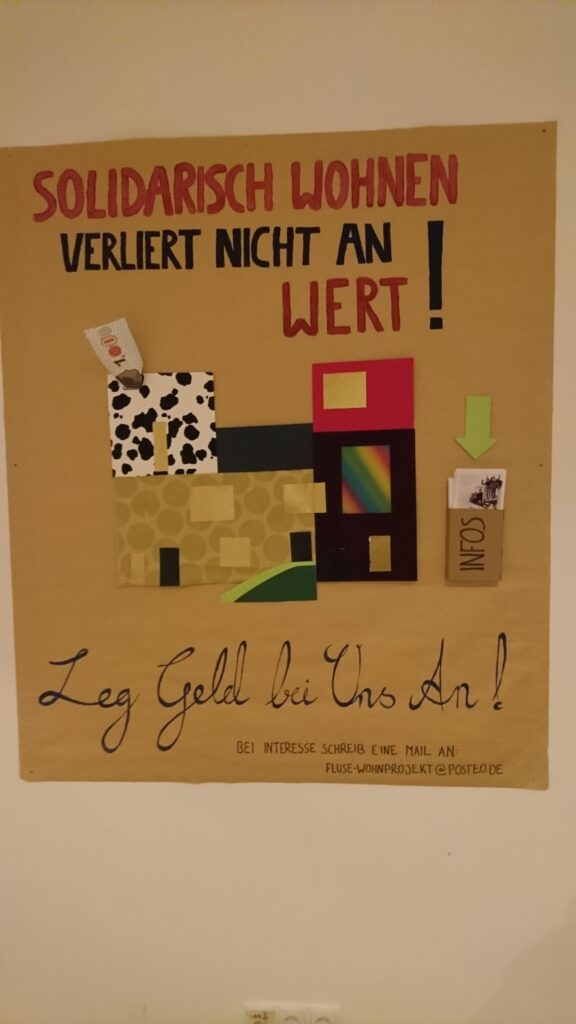 Auf der Mitgliederversammlung im September haben wir uns für eine sogenannte Beteiligung beworben. Unsere Bewerbung wurde einstimmig angenommen. Das Syndikat wird sich jetzt an der FLUSE beteiligen, also einen Anteil an unserer Haus-GmbH kaufen. Damit wird die FLUSE unverkäuflich und darf weiterhin nur als solidarisch finanzierter Miet-Wohnraum genutzt werden. Was es damit genau auf sich hat, könnt ihr hier nachlesen.